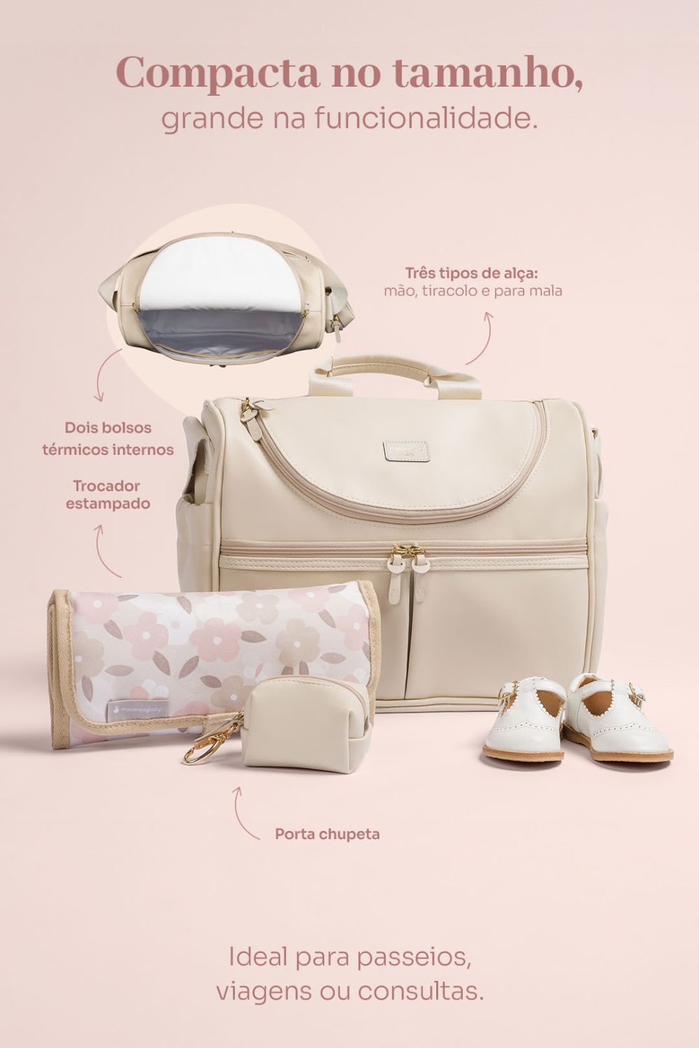 A Bolsa Nina Borboletas Marfim é um modelo clássico e neutro. Ela é perfeita para compor o Kit de Maternidade da sua pequena. O modelo é compacto e ideal para as mamães que buscam um modelo de bolsa de maternidade um pouco menor. A Bolsa Nina Borboletas é ótima para ir a consultas pediátricas, casa dos avós ou passeios no durante o final de semana. Internamente ela possui dois bolsos térmicos para mamadeiras e bolsos organizadores. Tem três tipos de alça, que são: alça de mão, alça tiracolo e alça para a mala de rodinhas. Acompanha o trocador com estampa Borboletas e porta chupeta marfim.