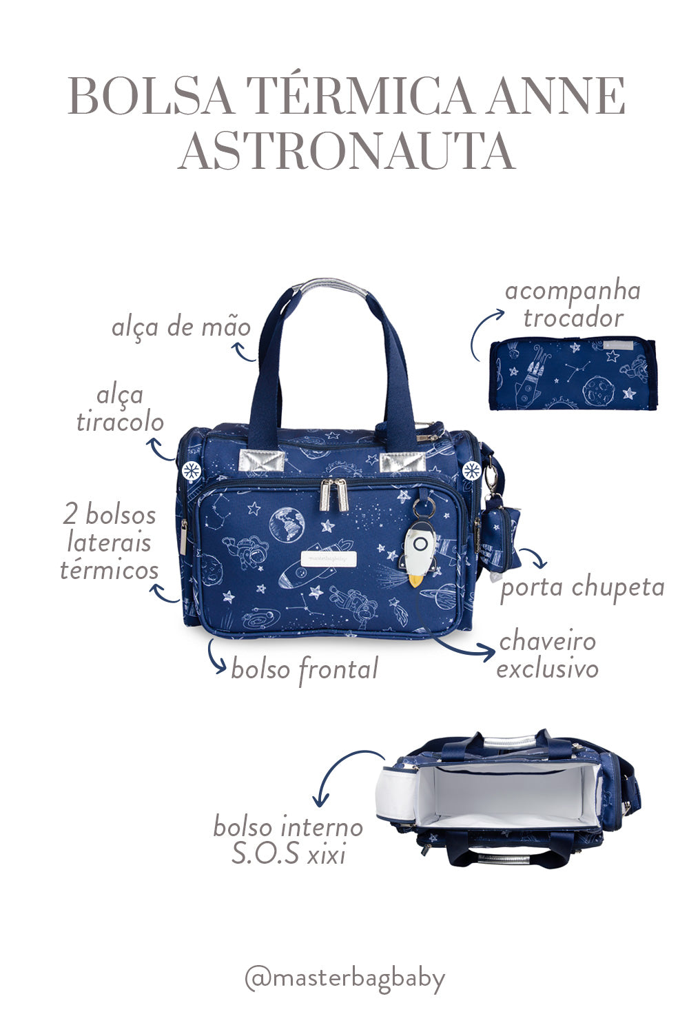 Acompanha trocador estampado, chaveiro no tema da coleção, porta-chupeta, alça de mão e alça tiracolo ajustável