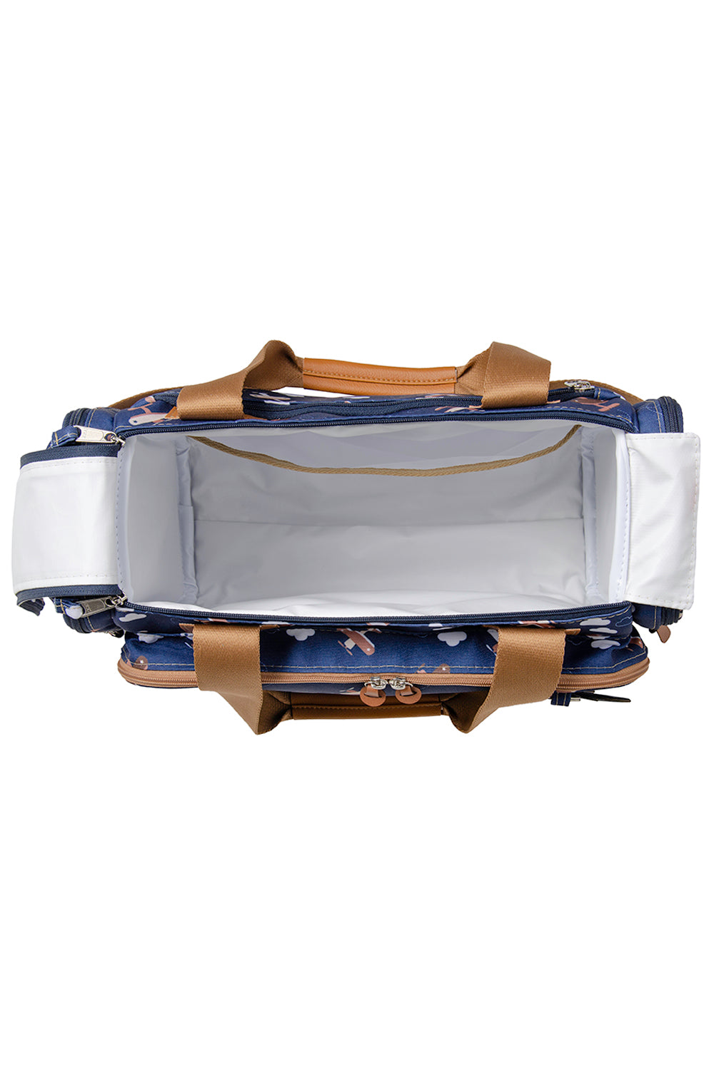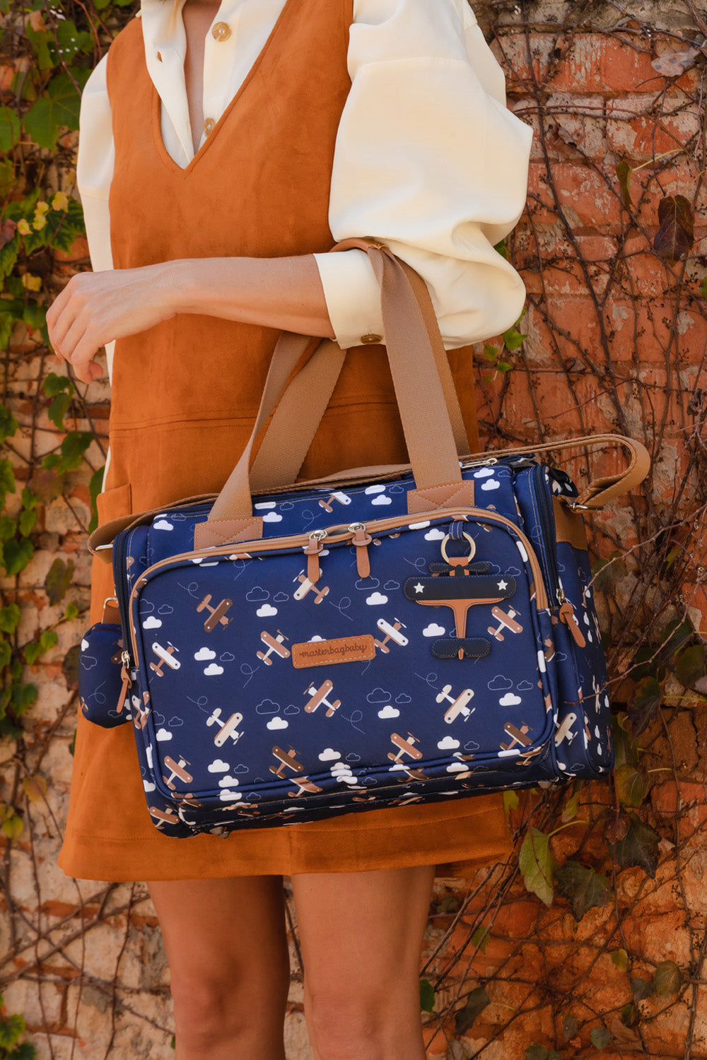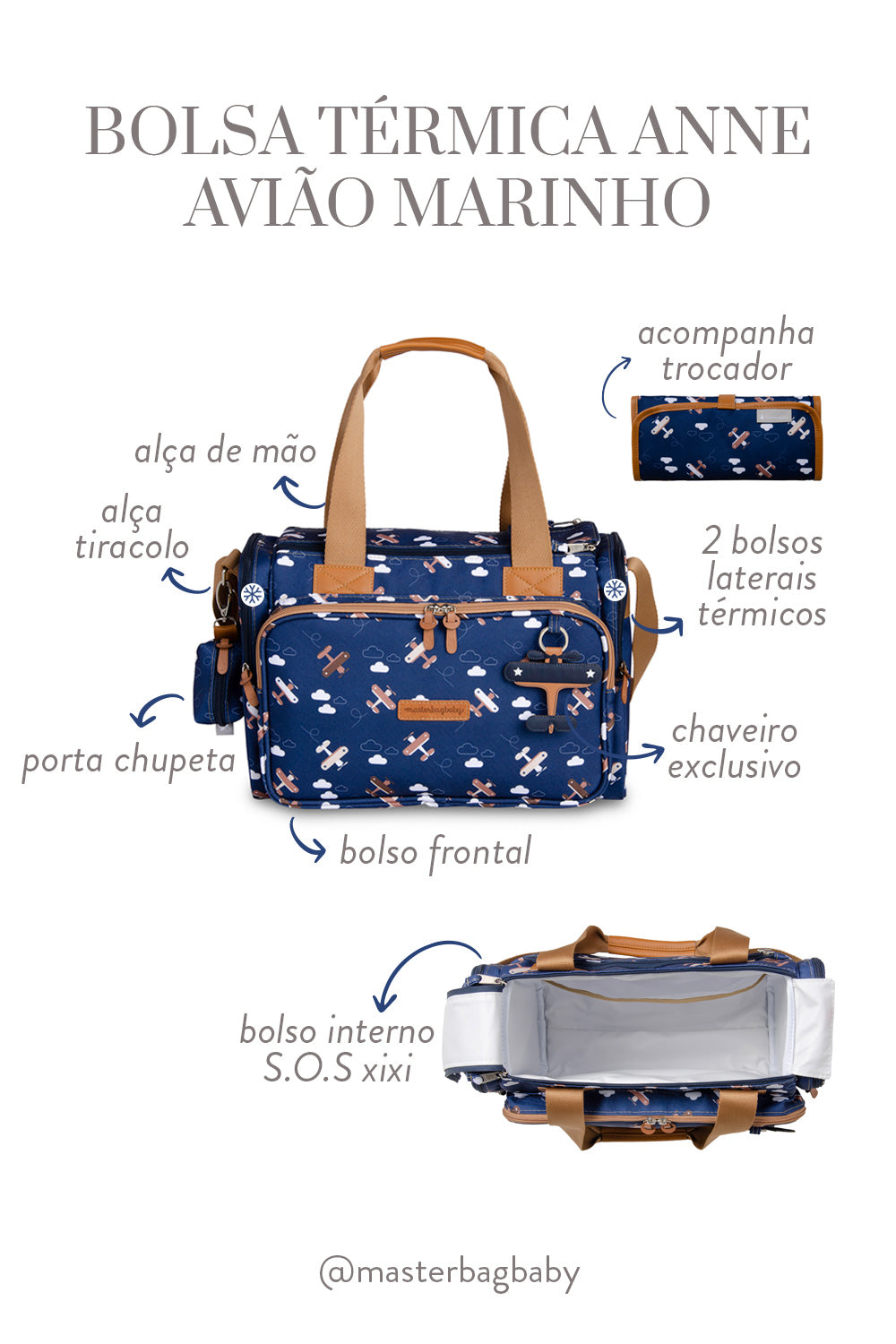 Acompanha trocador estampado, chaveiro de avião, porta-chupeta, alça de mão e alça tiracolo ajustável