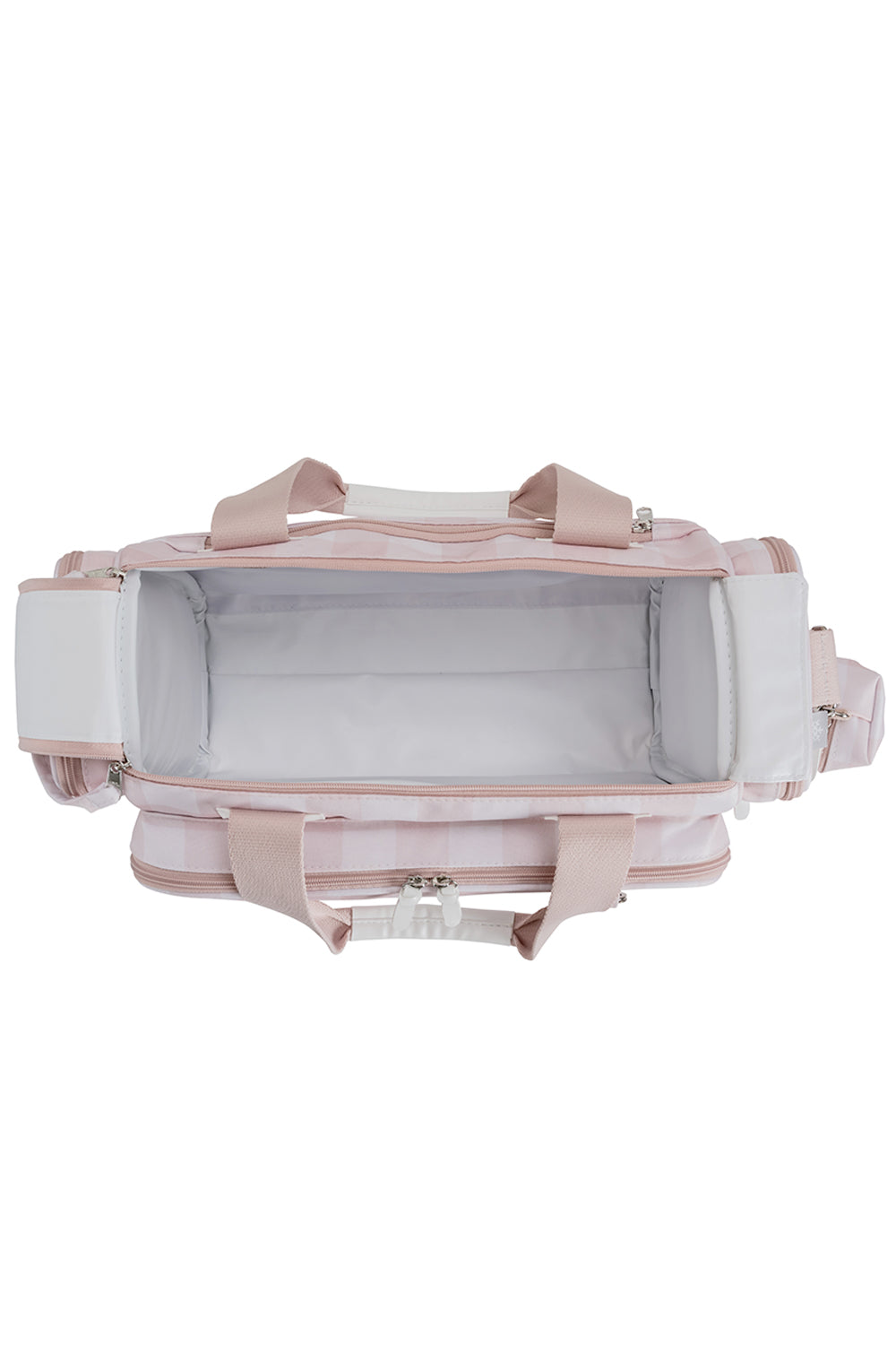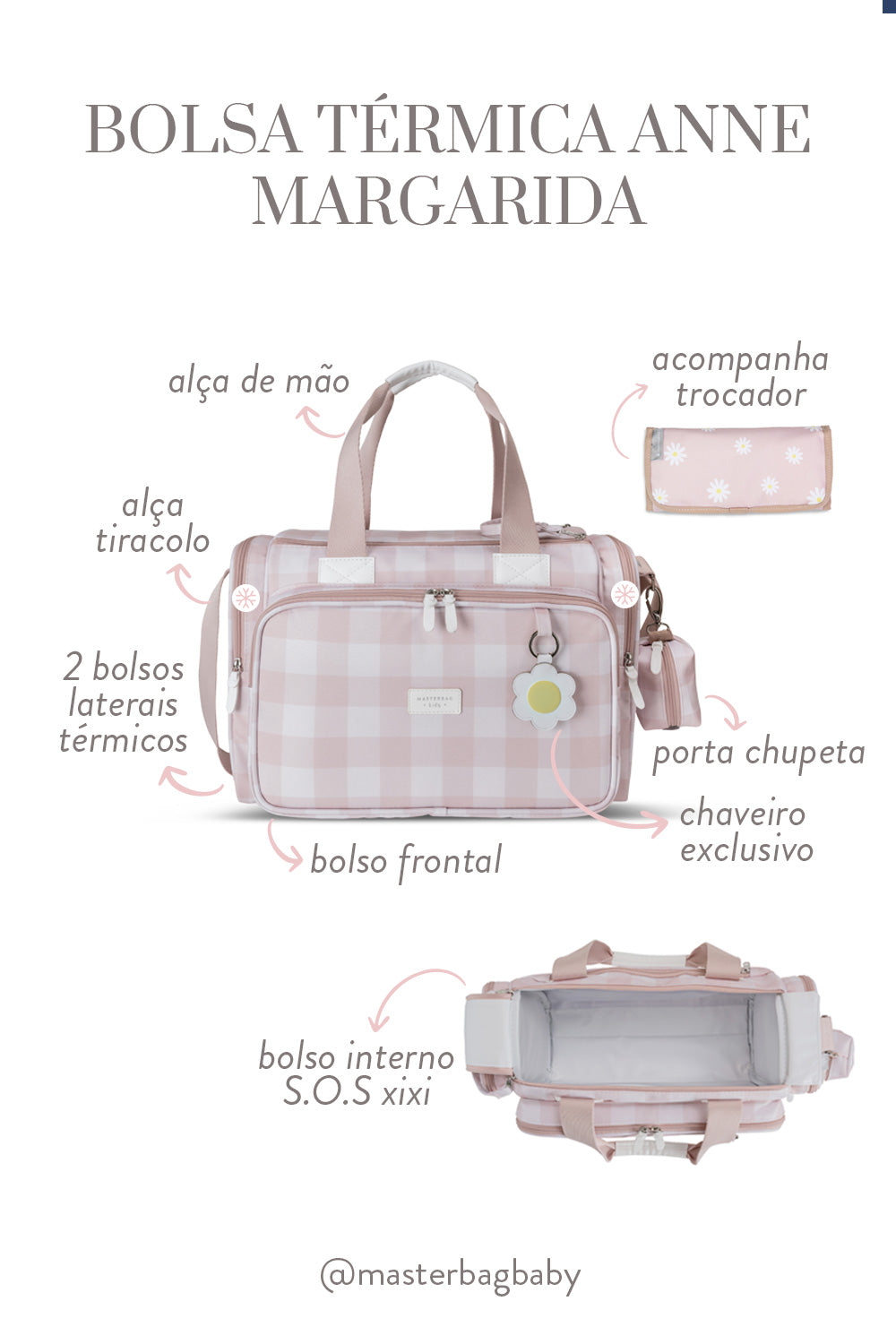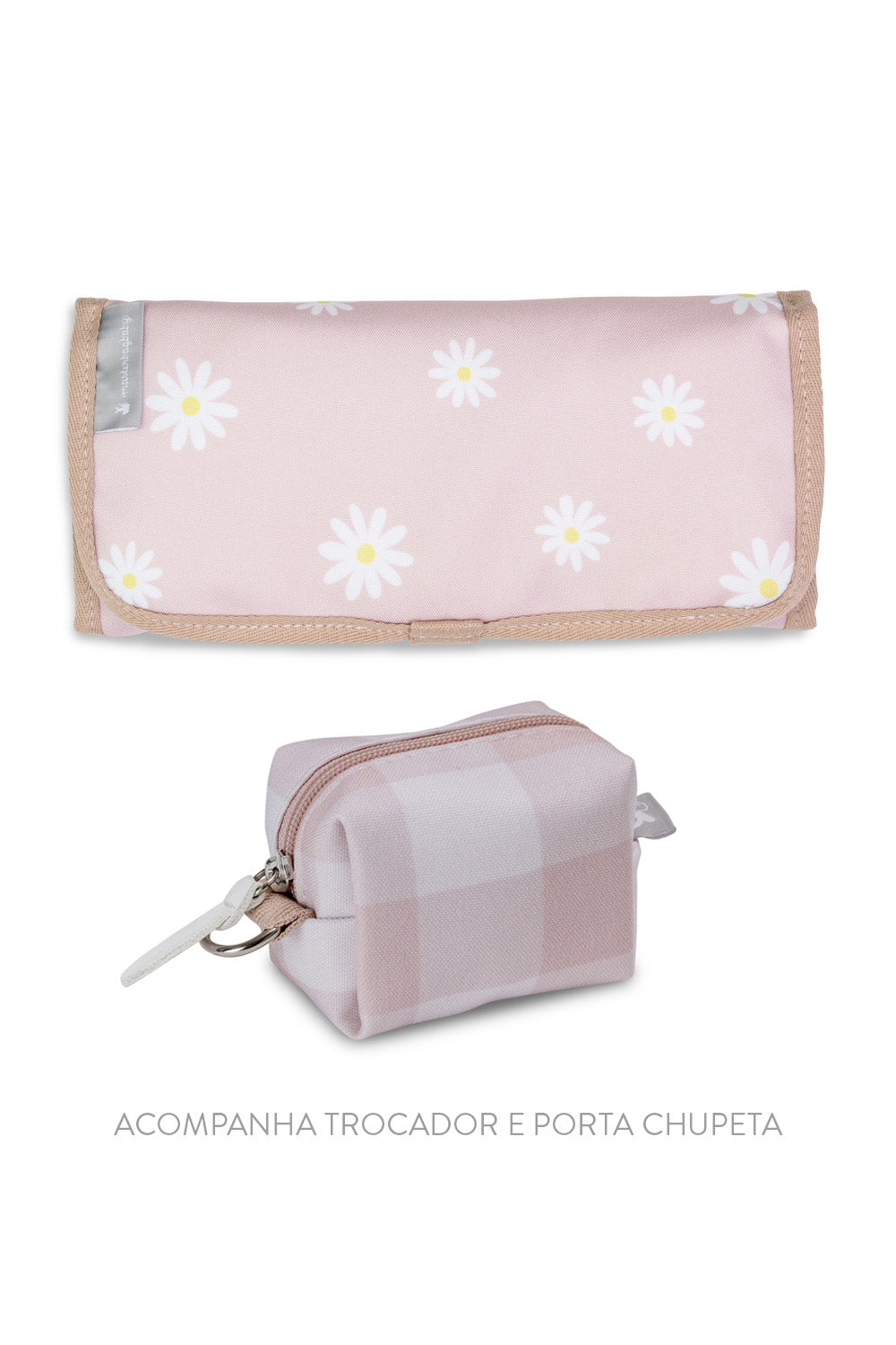 A Bolsa Anne Margaridas é perfeita para os passeios longos com sua pequena. Com estampa xadrez rosa e detalhes delicados, ela oferece espaço interno amplo para organizar trocas de roupa, fraldas, mantas e itens de higiene. Os bolsos laterais térmicos são ideais para manter mamadeiras ou garrafinhas fresquinhas. Acompanha trocador estampado com mini margaridinhas, chaveiro de flor e porta-chupeta combinando.