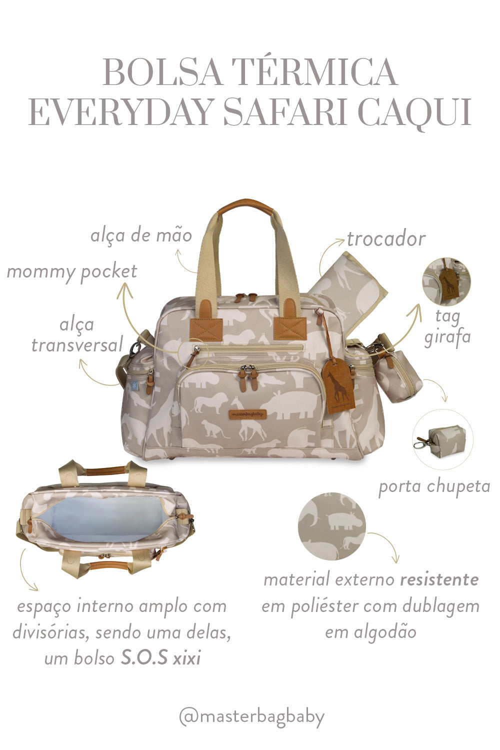A Bolsa de Maternidade Safari Everyday é uma das queridinhas da Masterbag baby! Ela tem tudo o que a mamãe e o papai precisam para organizar os acessórios do bebê para a hora do passeio. Seus bolsos laterais são térmicos para garrafinhas ou mamadeiras, possui o chamado "Mommy Pocket" para os acessórios da mamãe, internamente possui bolso com proteção para roupinhas sujas ou molhadas e ainda acompanha trocador, porta chupeta e alça tiracolo. É super moderna e ideal para os passeios longos com seu bebê.