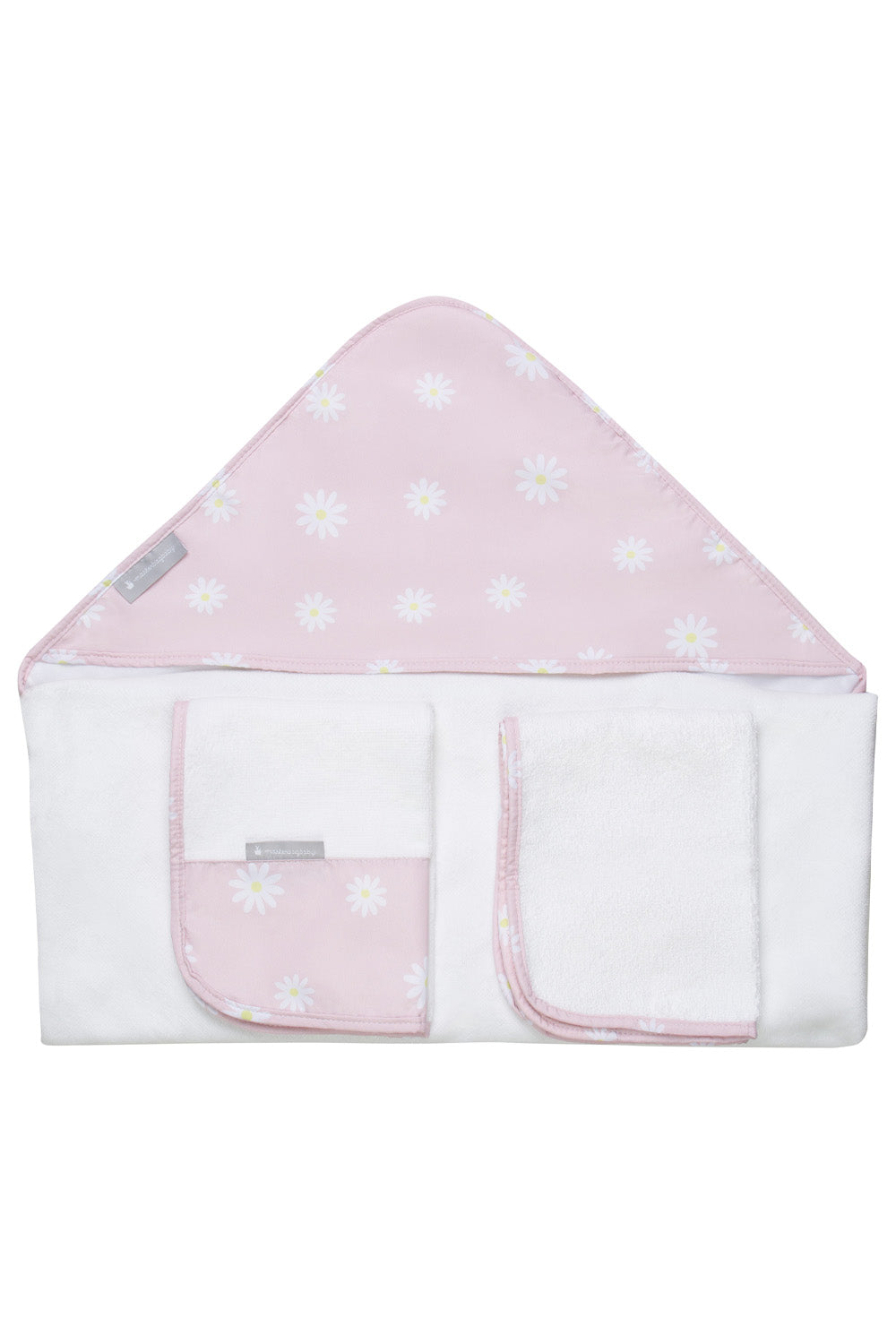 A pele do bebê requer cuidados adicionais. Com isso em mente, a Masterbag desenvolveu uma gama de toalhas feitas com materiais de excelente qualidade e extremamente confortáveis. A textura é delicada e agradável, exatamente o que a pele sensível da sua bebê precisa. Todas as toalhas são revestidas com tecido fralda feito inteiramente de algodão, tornando a secagem muito mais conveniente para os pais. O conjunto inclui duas toalhas pequenas: uma para o rosto, ideal para escovar os dentes ou administrar vitaminas, e outra para o bumbum, perfeita para trocas rápidas. A toalha "Margaridas" possui um capuz e acabamento com estampa de florzinhas, coordenando com a coleção de produtos "Margaridas". É uma opção encantadora que proporciona um cuidado adicional à pele da sua pequena.