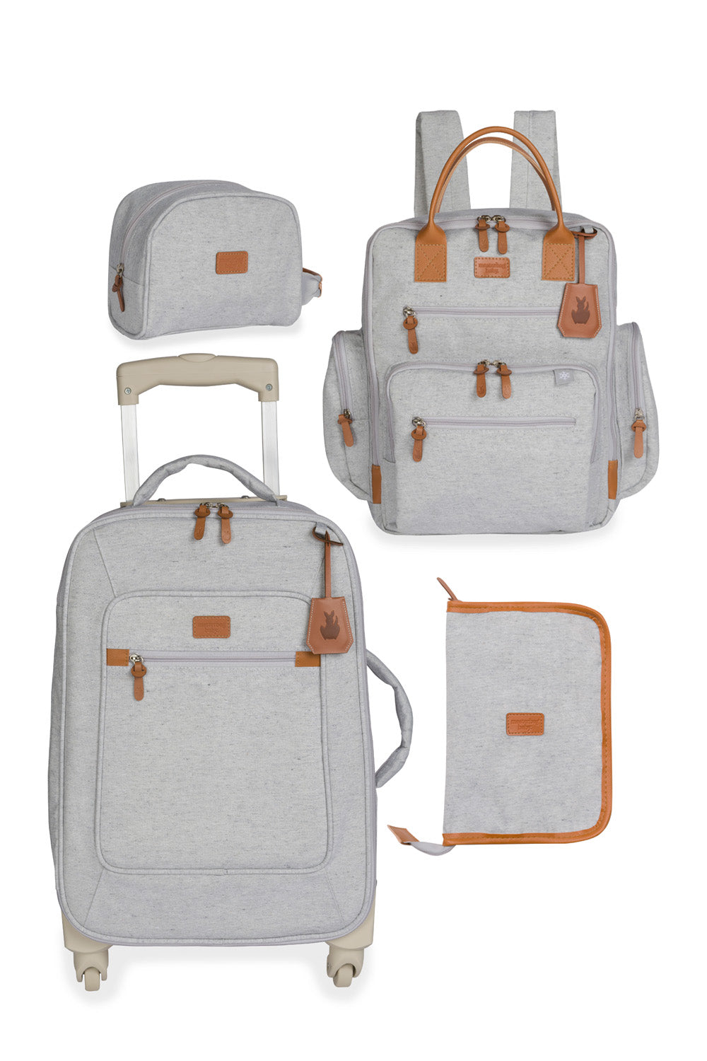 Dimensões: Mala de rodinhas: 53x35x20cm | Mala com a alça toda esticada: 91x30x20cm | Mochila Urban: 35x32x16cm | Porta carteira de vacinação: 25x17cm (fechado) | 25x35cm (aberto) | Nécessaire Baby: 21x18x14cm.