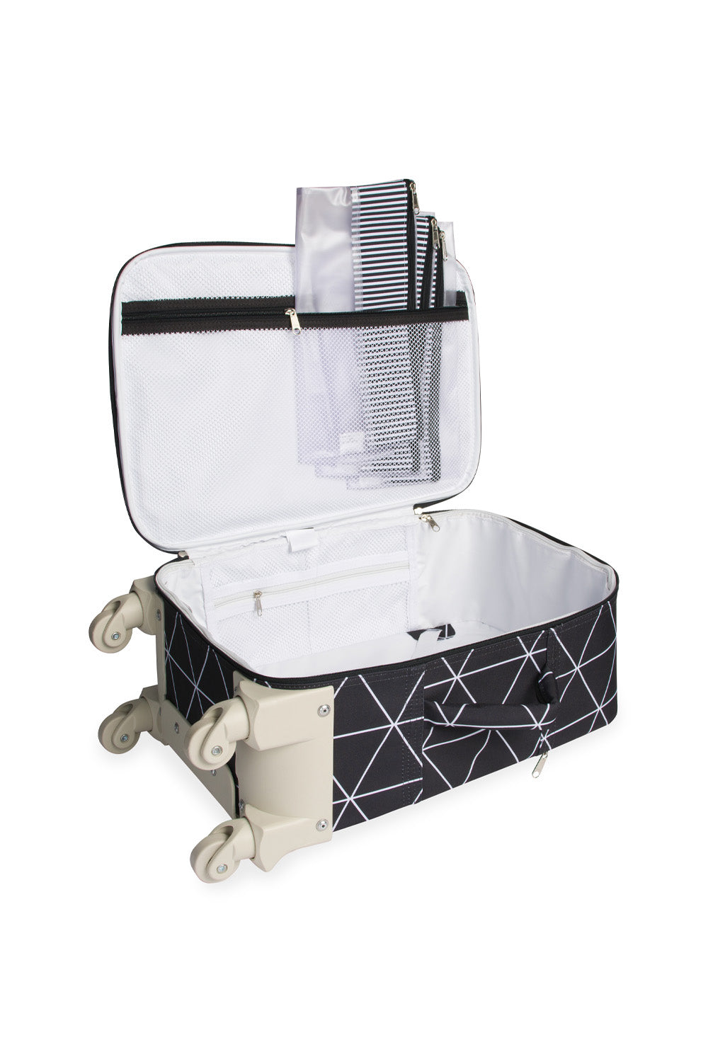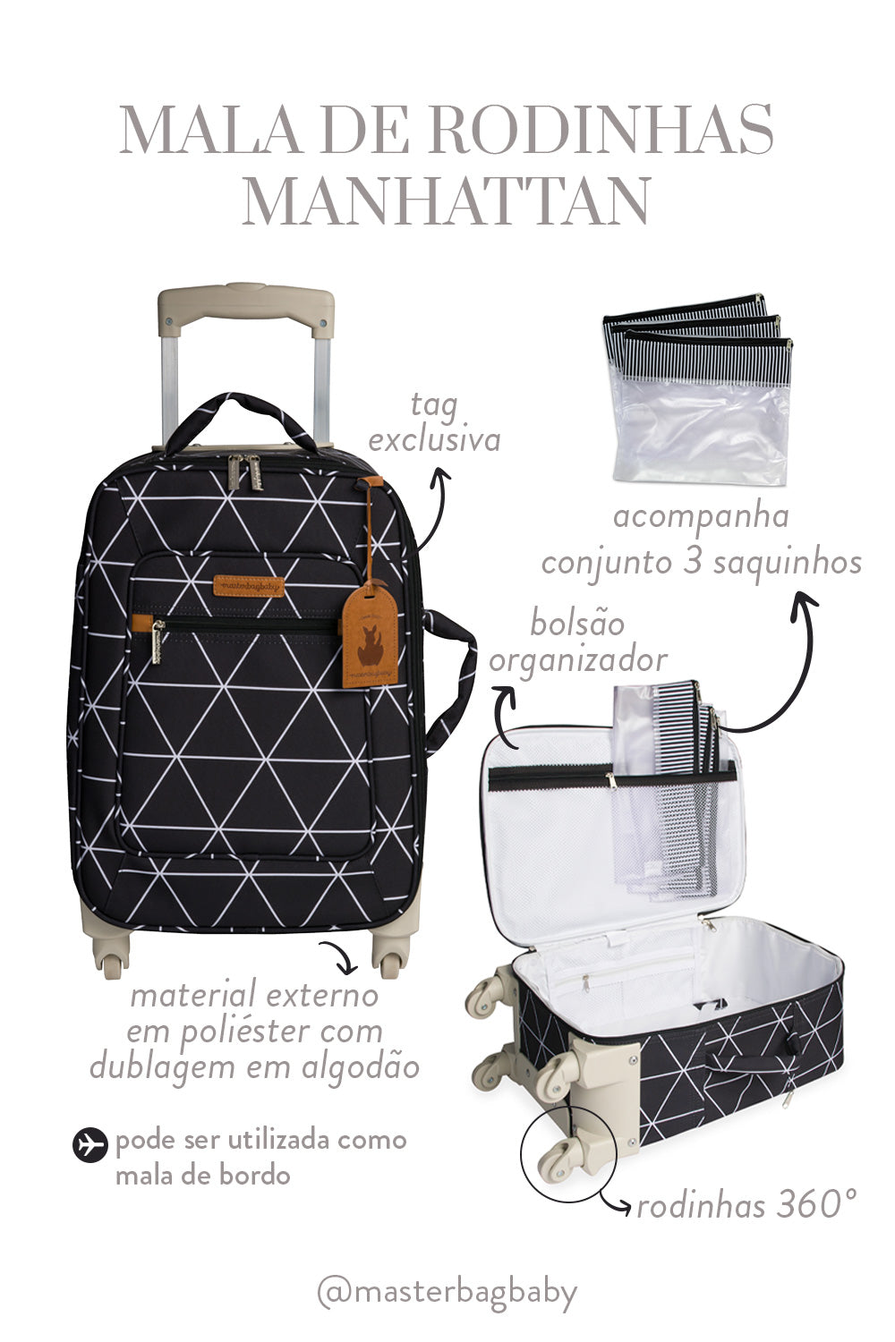 Com design moderno e unissex, a Mala de Rodinhas Manhattan é feita para quem busca estilo e praticidade. Produzida em DuoTex resistente com estampa geométrica, ela possui rodinhas 360°, tag personalizada da Masterbag e três saquinhos organizadores listrados, criando um mix de estampas super cool!