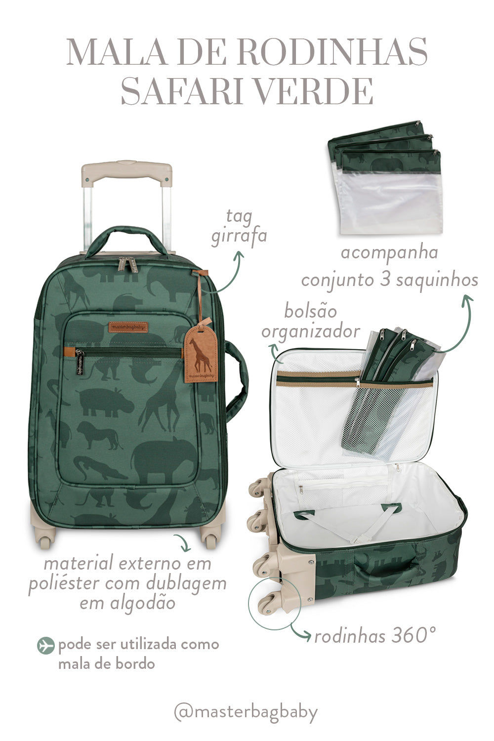 Com rodinhas 360° e medidas compatíveis com as normas da ANAC, pode ser usada como mala de bordo, garantindo praticidade e mobilidade em todos os trajetos. Acompanha 3 saquinhos organizadores com estampa Safari, perfeitos para separar as roupinhas do bebê com carinho, além de uma tag de girafa exclusiva, que adiciona um toque divertido e lúdico à peça.