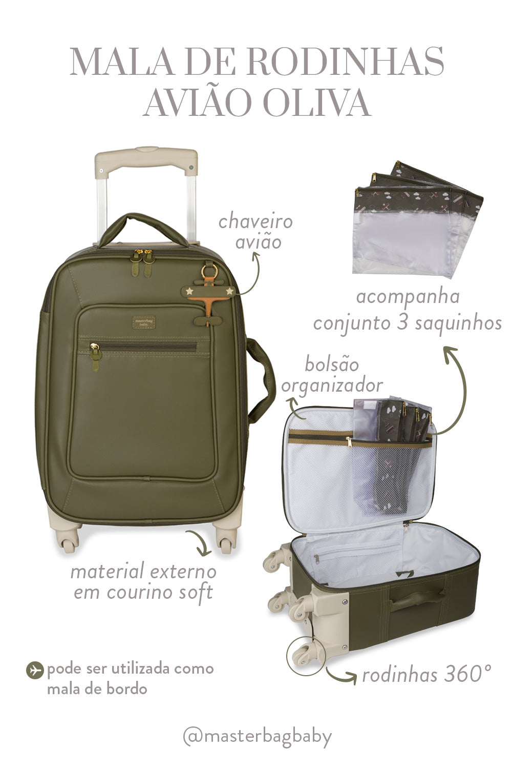 A Mala de Rodinhas Avião Oliva foi criada para tornar a organização da maternidade mais leve, prática e cheia de estilo. Ideal para levar todas as trocas de roupa do bebê no dia do nascimento, ela tem espaço interno amplo e acompanha três saquinhos organizadores no tema da coleção — perfeitos para manter as roupinhas do enxoval separadas e prontinhas para usar. Com rodinhas 360° e medidas corretas para levar dentro do avião, ela é uma malinha funcional para muito além da maternidade.