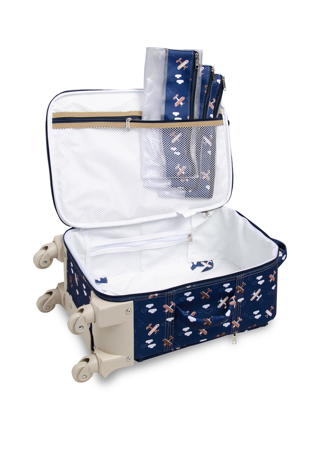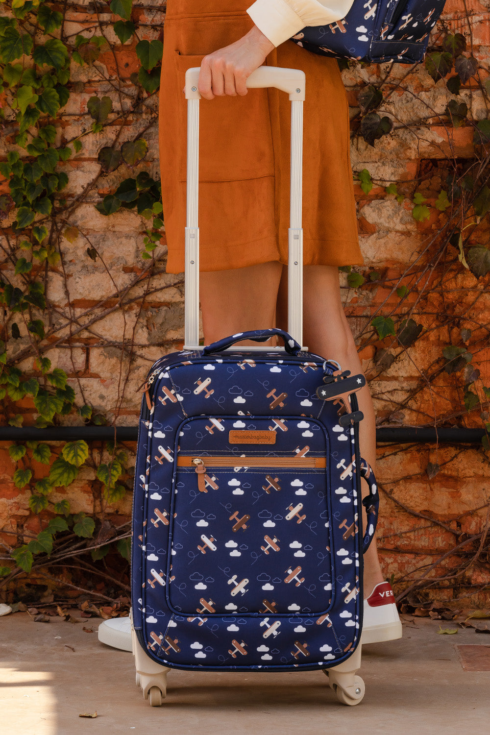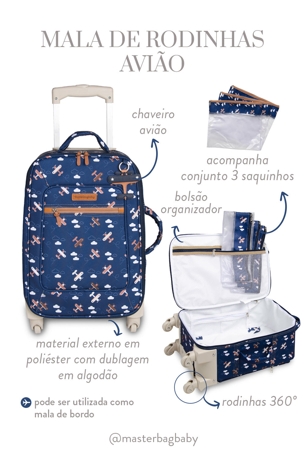 A Mala de Rodinhas Avião Marinho da Masterbag é perfeita para acompanhar os meninos desde a sua chegada ao mundo até muitas aventuras mundo afora! Com estampa exclusiva no tema avião, ela une charme e praticidade para a rotina das famílias. Suas rodinhas 360° facilitam o transporte e suas dimensões são compatíveis com as normas da ANAC, permitindo que seja usada como mala de bordo. Acompanha três saquinhos organizadores e um chaveiro de avião, tornando a organização dos pertences do bebê muito mais prática e funcional.