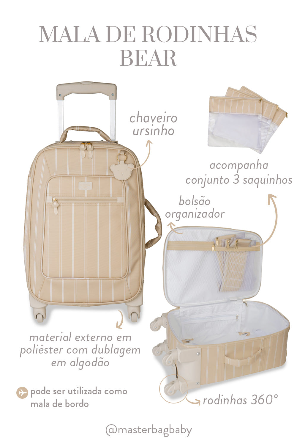 A Mala de Rodinhas Bear é perfeita para acompanhar os pequenos desde a maternidade até as viagens em família. Com rodinhas 360° que facilitam o transporte e dimensões compatíveis com as normas da ANAC, ela pode ser levada como mala de bordo, garantindo mais praticidade nas viagens em família. Acompanha três saquinhos organizadores no tema ursinhos, que são ótimos para organizar as roupinhas e outros itens importantes.