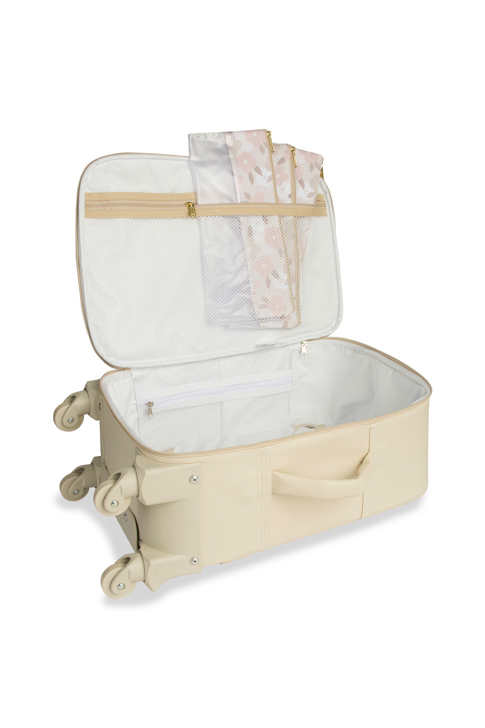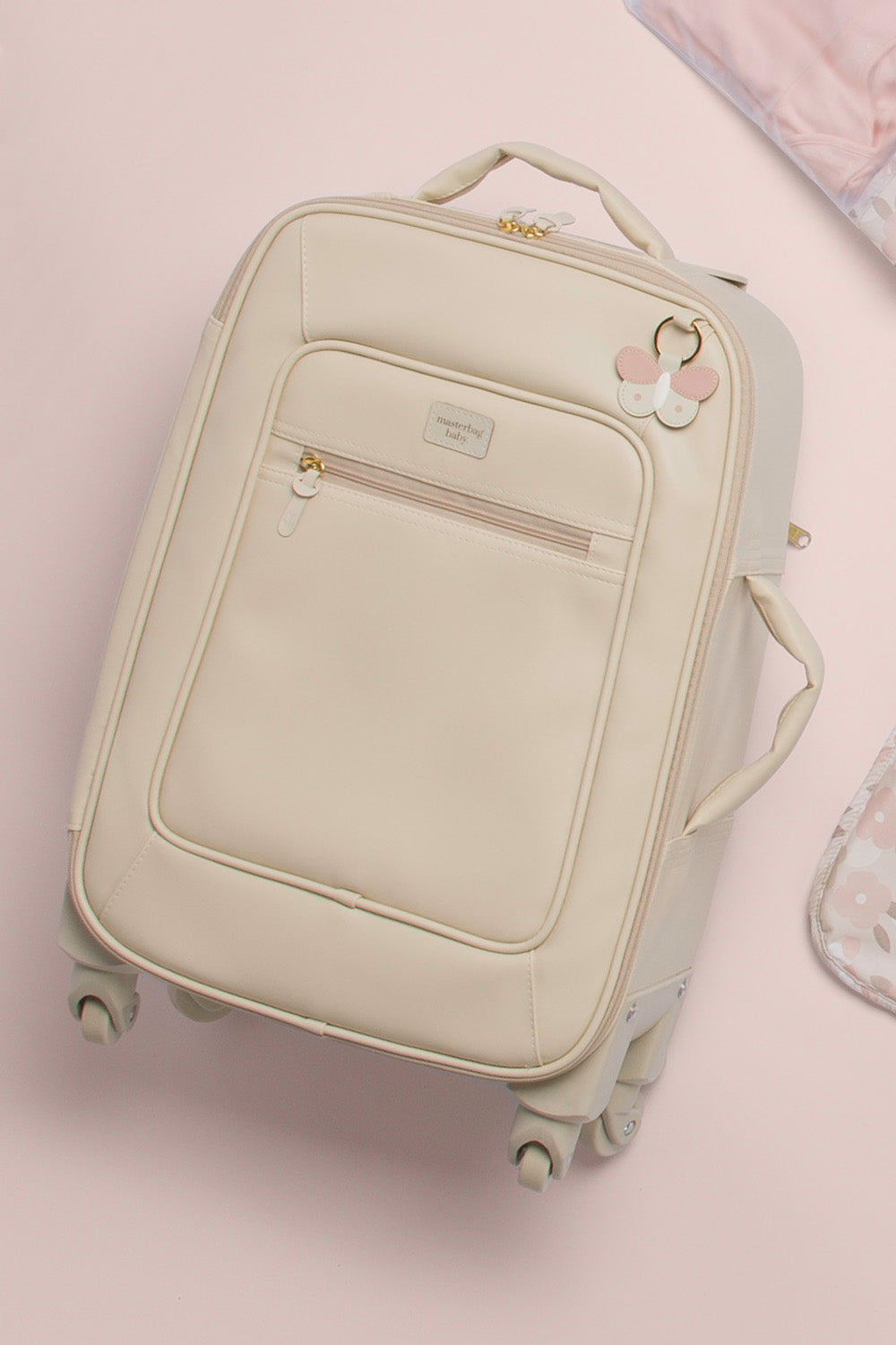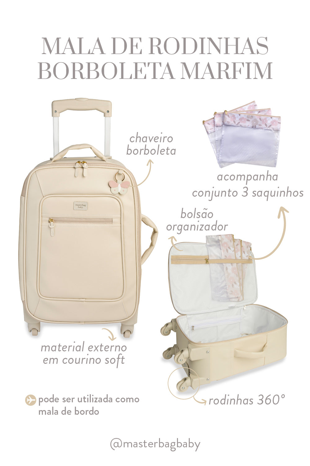 A Mala de Rodinhas Borboletas Marfim é o modelo ideal para organizar as roupinhas e acessórios necessários para a chegada da sua pequena ao mundo! Ela vem com três saquinhos organizadores estampados para tornar a organização mais prática. Seu material externo é o exclusivo Napa Soft Masterbag Baby, resistente, fácil de limpar (basta um pano úmido com sabão neutro) e que não descasca com o tempo. Uma escolha elegante, durável e pensada para acompanhar você em todas as fases da maternidade.