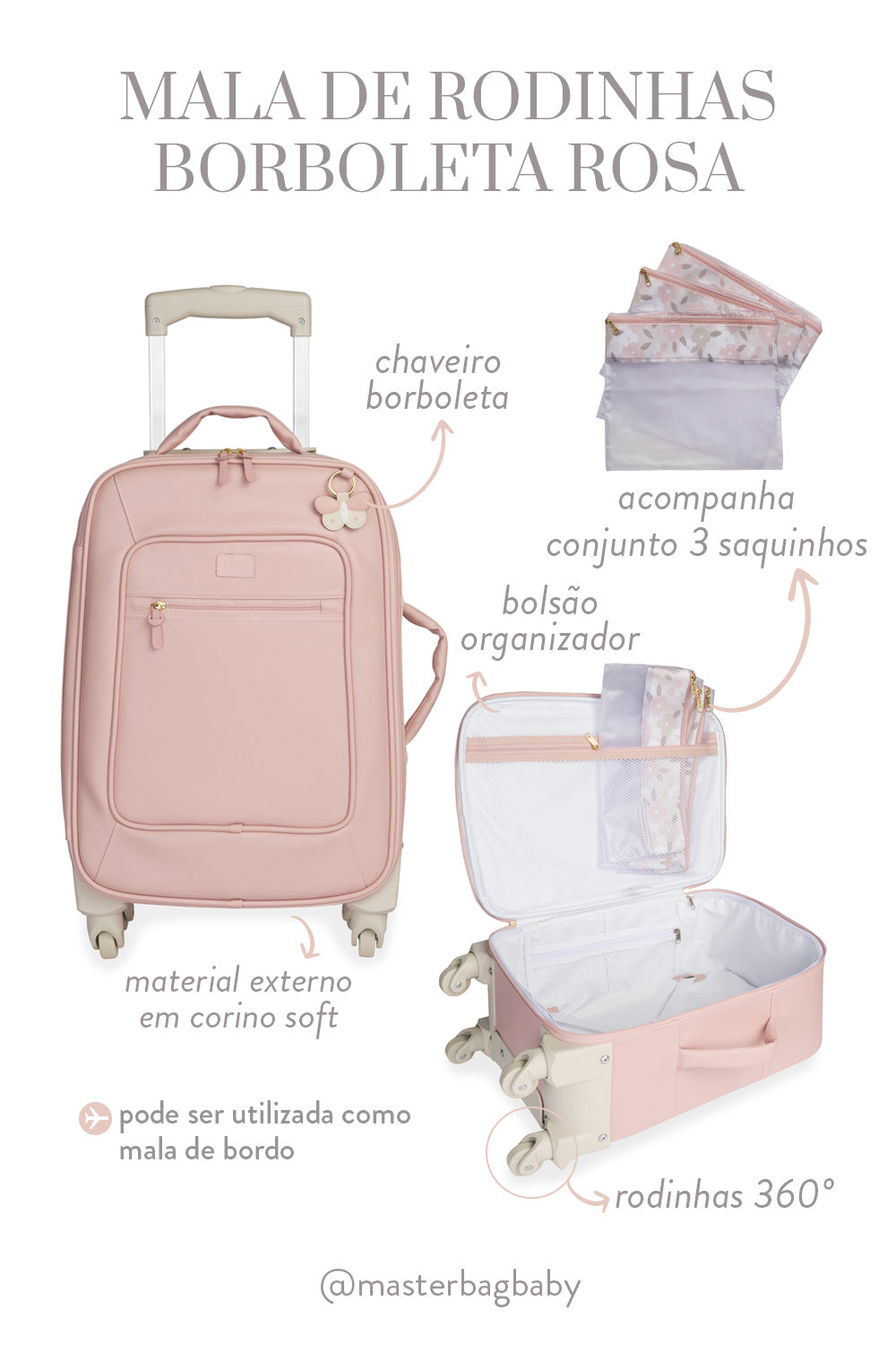 A Mala de Rodinhas Borboletas é perfeita para organizar todos os itens da sua pequena para a ida à maternidade e futuras viagens em família. Suas rodinhas são 360° e suas medidas estão de acordo com as estabelecidas pela ANAC - pode ser utilizada como mala de bordo. Ela é toda revestida por um material sofisticado e resistente. Acompanha chaveiro borboletas e três saquinhos organizadores ideias para guardar os lookinhos da maternidade e para futuramente organizar itens da viagem da sua pequena.