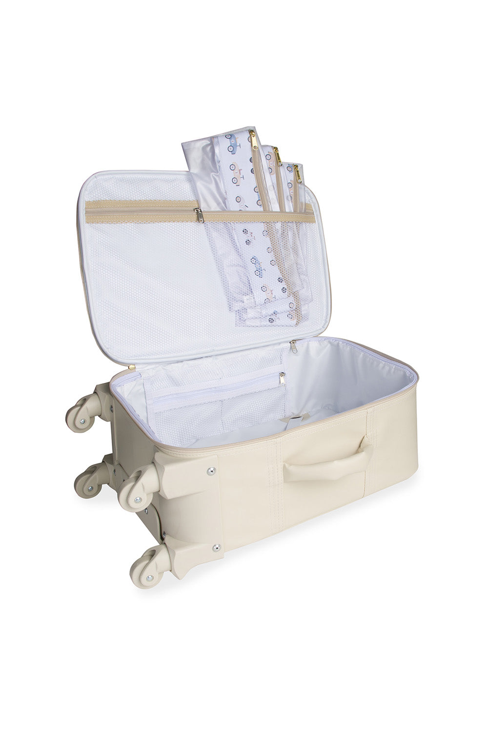 Com visual delicado e funcionalidade de sobra, a Mala de Rodinhas Carrinhos Marfim é ideal para organizar as trocas da maternidade e também para levar nas viagens com o bebê. O Napa Soft garante um toque sofisticado e alta durabilidade, sem risco de descascar com o tempo. Acompanha chaveiro de carrinhos e três saquinhos organizadores estampados, que deixam tudo no lugar certo.