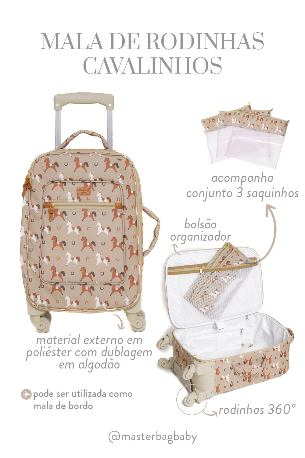 A Mala de Rodinhas Cavalinhos Estampada é perfeita para acompanhar os pequenos desde a maternidade até as viagens em família. Com rodinhas 360° que facilitam o transporte e dimensões compatíveis com as normas da ANAC, ela pode ser levada como mala de bordo, garantindo mais praticidade nas viagens em família. Acompanha três saquinhos organizadores no tema cavalinhos, que são ótimos para organizar as roupinhas e outros itens importantes.