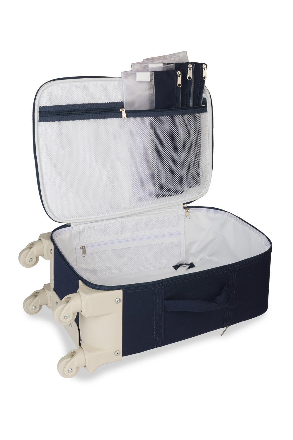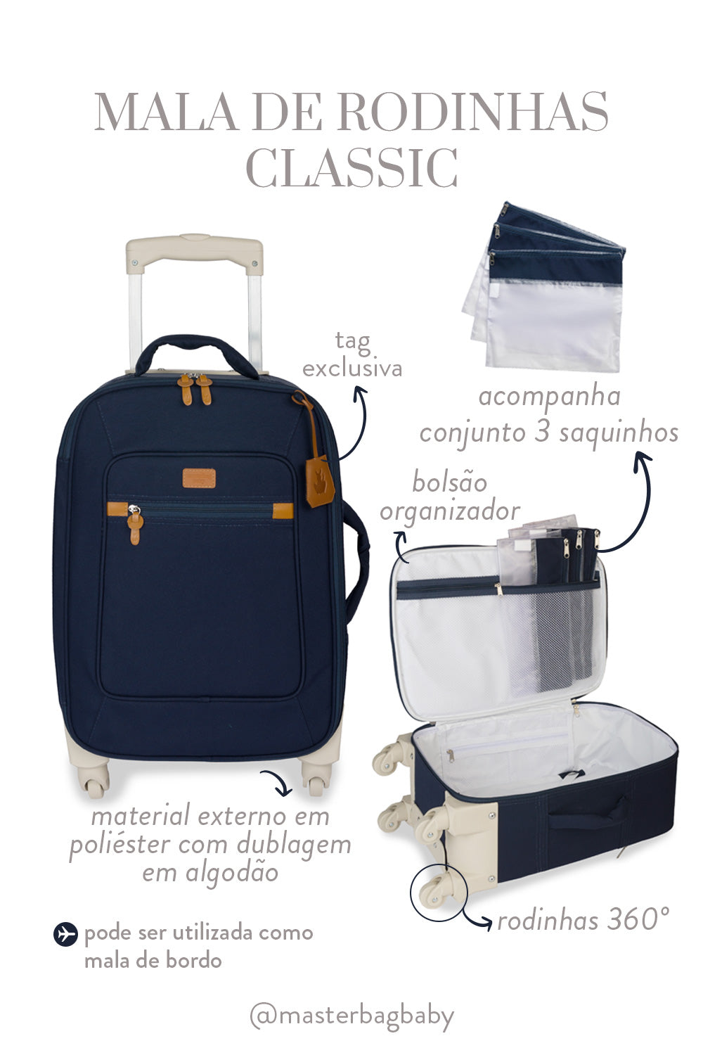 A Mala de Rodinhas Classic Marinho é a companheira ideal para levar as roupinhas do bebê no dia da maternidade e acompanhar a família nas próximas aventuras. Seu design clean e atemporal é neutro e vai acompanhar seu(a) pequeno por muito tempo! As rodinhas 360° facilitam o transporte, e o tamanho segue as normas da ANAC, podendo ser usada como bagagem de mão em viagens de avião. Acompanha 3 saquinhos organizadores lisos, ideais para separar as roupinhas e acessórios com cuidado e praticidade.