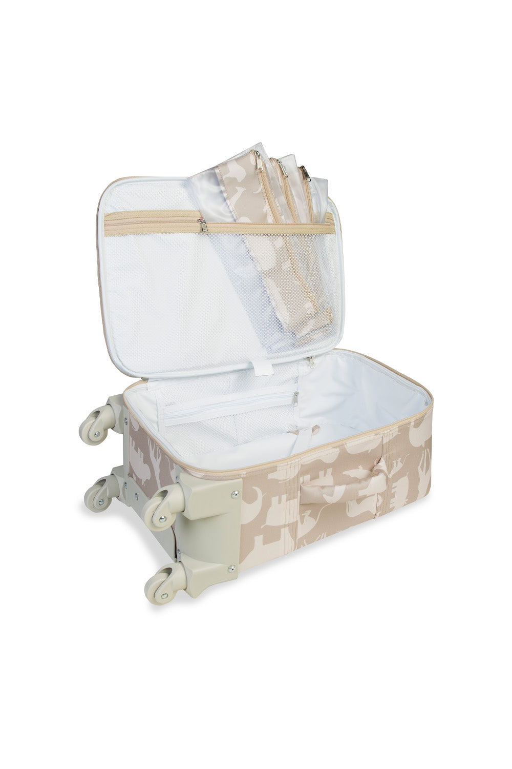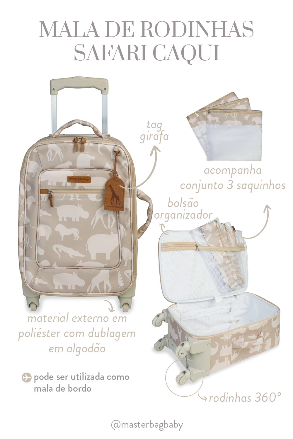 A Mala de Rodinhas Safari foi criada para acompanhar os pequenos em muitas aventuras - desde a chegada na maternidade à futuras viagens em família. Feita em tecido DuoTex, ela é resistente e vai andar com seu pequeno por muito tempo. Possui rodinhas 360° e medidas ideais para uso como mala de bordo. Acompanha 3 saquinhos organizadores com estampa Safari para separar as roupinhas com praticidade e uma tag de girafa que dá um toque divertido à malinha.