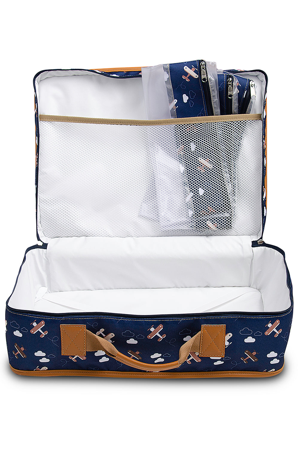 A Mala Vintage Avião é a companheira ideal para a ida à maternidade e futuras viagens com o seu filhote! A coleção Avião combina o contraste do azul marinho do tecido com os detalhes em couro sintético caramelo, proporcionando um acabamento moderno à peça. Com um amplo compartimento interno, essa mala oferece espaço para acomodar todos os itens essenciais do bebê, como roupas, fraldas e mantas. Os elásticos internos garantem a organização e segurança dos pertences durante viagens ou passeios. A mala acompanha três saquinhos organizadores com a mesma estampa da peça que ajudam no planejamento da ida à maternidade. O bolso frontal conta com uma tela organizadora e é ideal para guardar os documentos do bebê. Com a Mala Vintage, mamães e papais terão a união perfeita entre estilo vintage e funcionalidade moderna para uma experiência de maternidade mais organizada e encantadora!