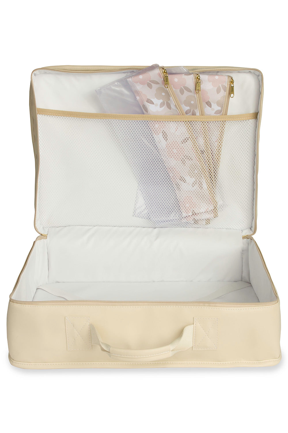 A Mala Vintage Borboletas é a companheira ideal para a ida à maternidade e futuras viagens com o seu filhote! As peças em marfim, combinadas à delicada estampa floral dos acessórios, compõem uma coleção perfeita para quem busca um conjunto monocromático e elegante! Com um amplo compartimento interno, essa mala oferece espaço para acomodar todos os itens essenciais do bebê, como roupas, fraldas e mantas. Os elásticos internos garantem a organização e segurança dos pertences durante viagens ou passeios. A mala acompanha três saquinhos organizadores estampados que ajudam no planejamento da ida à maternidade. O bolso frontal conta com uma tela organizadora e é ideal para guardar os documentos do bebê. Com a Mala Vintage, mamães e papais terão a união perfeita entre estilo vintage e funcionalidade moderna para uma experiência de maternidade mais organizada e encantadora!