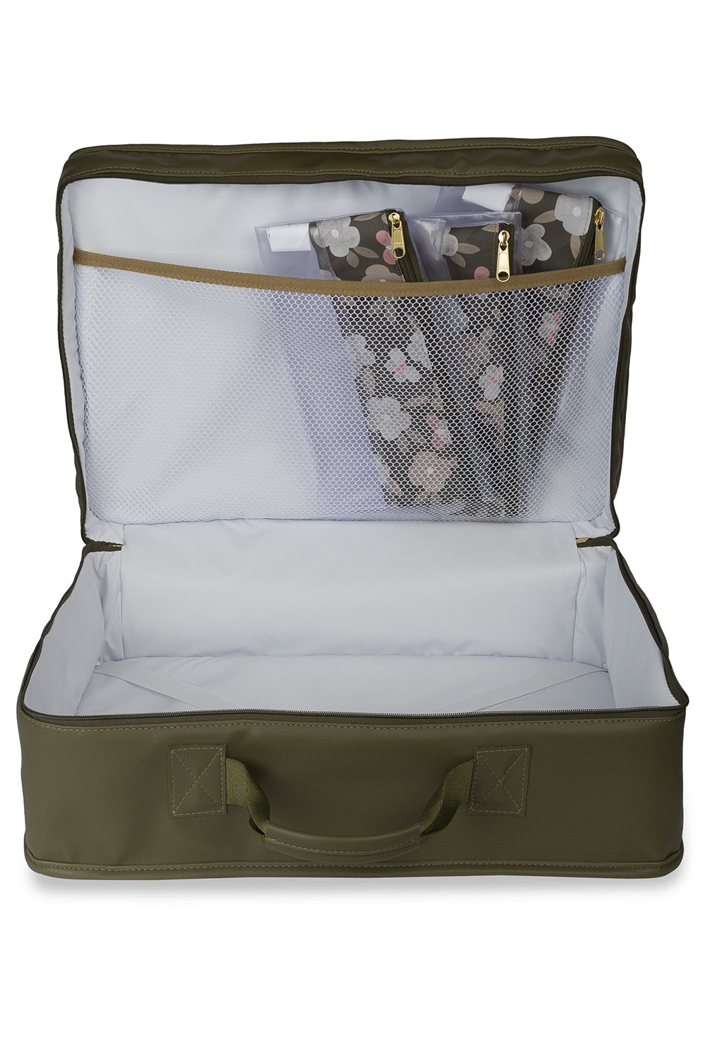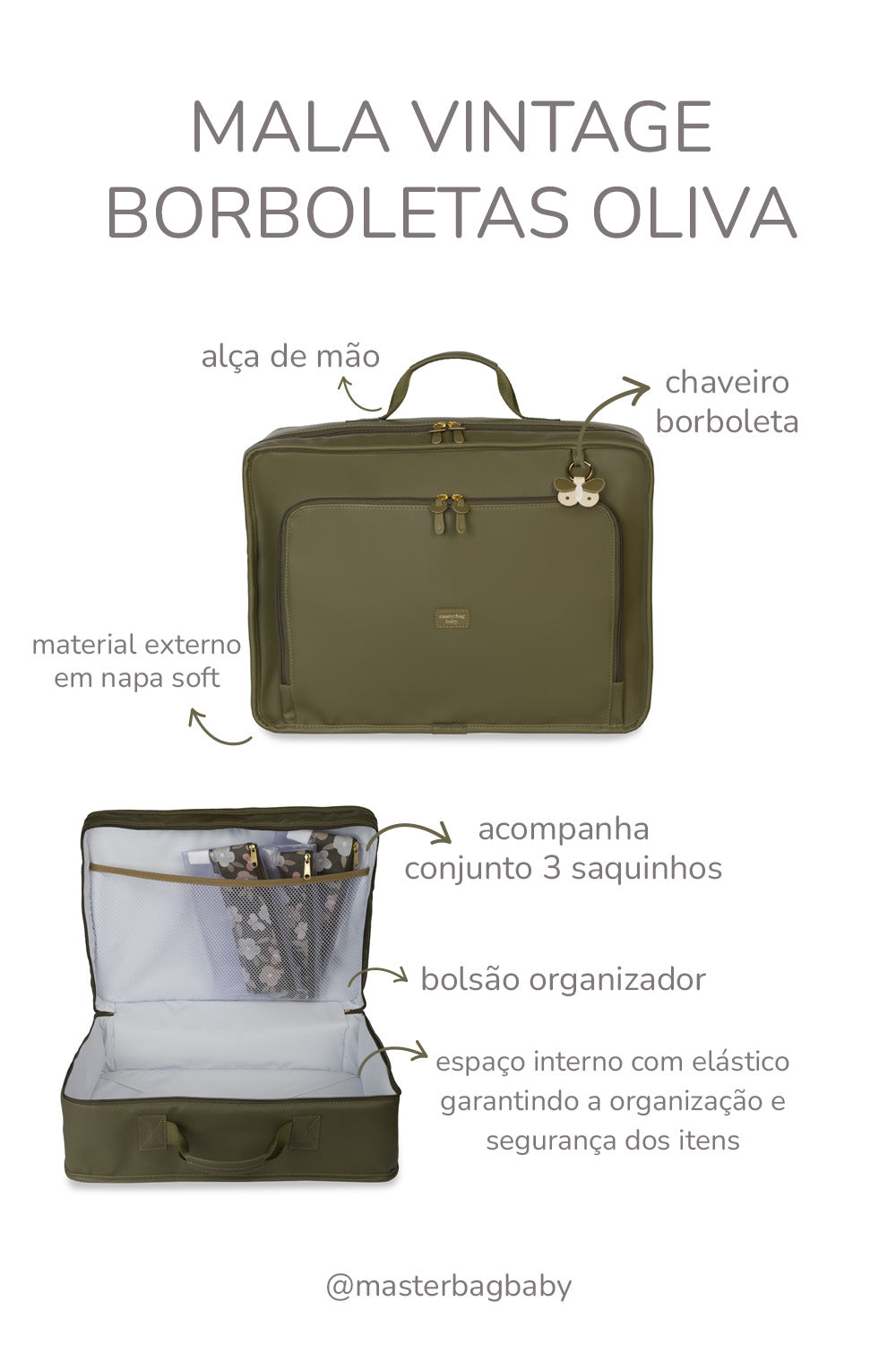 A Mala Vintage Borboletas Oliva é a companheira ideal para a ida à maternidade e futuras viagens! Com um amplo compartimento interno, essa mala oferece espaço para acomodar todos os itens essenciais do bebê, como roupas, fraldas e mantas. Os elásticos internos garantem a organização e segurança dos pertences durante viagens ou passeios. A mala acompanha três saquinhos organizadores estampados que ajudam no planejamento da ida à maternidade. O bolso frontal conta com uma tela organizadora e é ideal para guardar os documentos do bebê. Com a Mala Vintage, mamães e papais terão a união perfeita entre estilo vintage e funcionalidade moderna para uma experiência de maternidade mais organizada e encantadora!