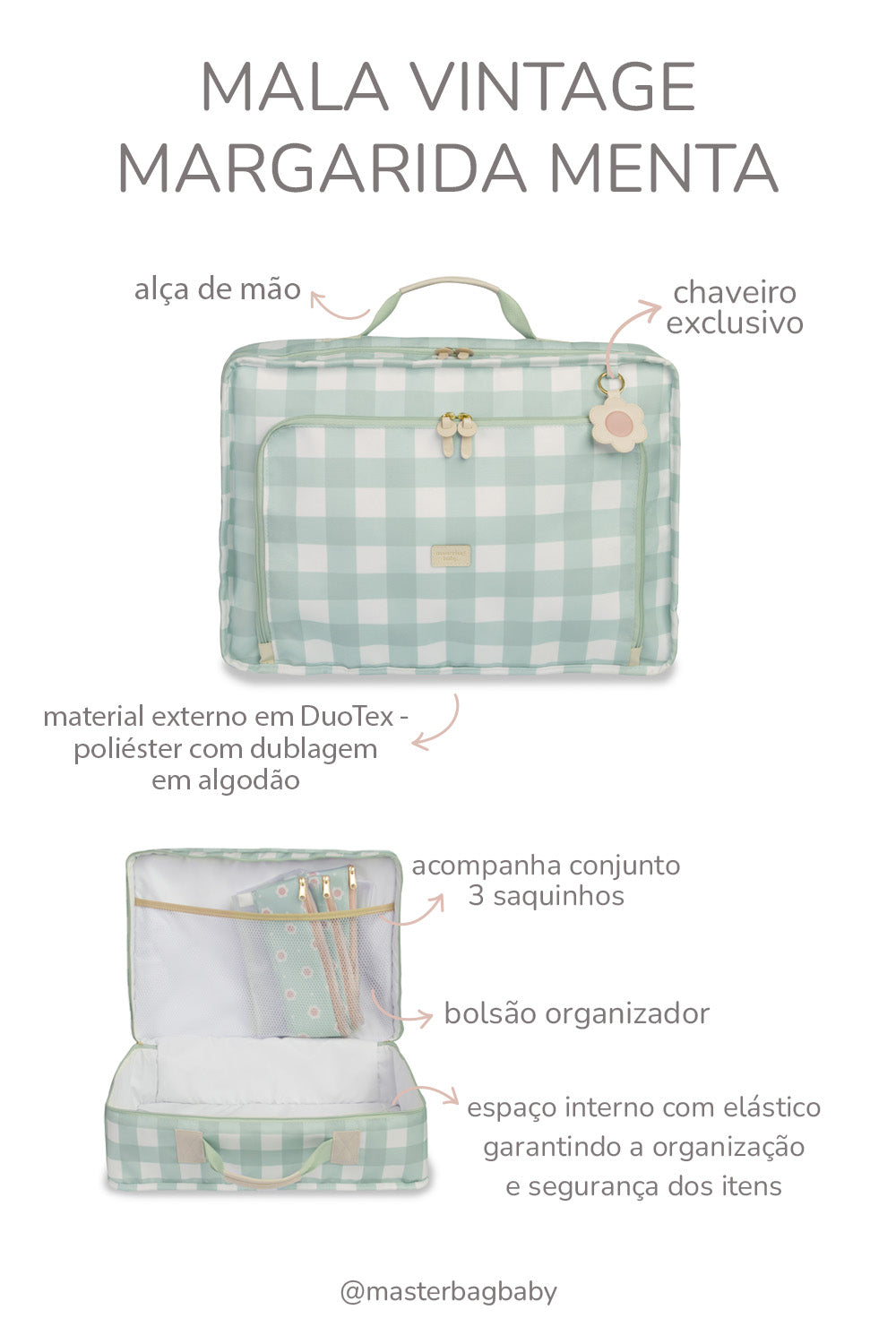 A Mala Vintage Margarida Menta Estampada Masterbag Baby foi feita para acompanhar a família nos momentos mais especiais: perfeita para a ida à maternidade, viagens de fim de semana ou até aquela primeira noite dormindo na casa da vovó.