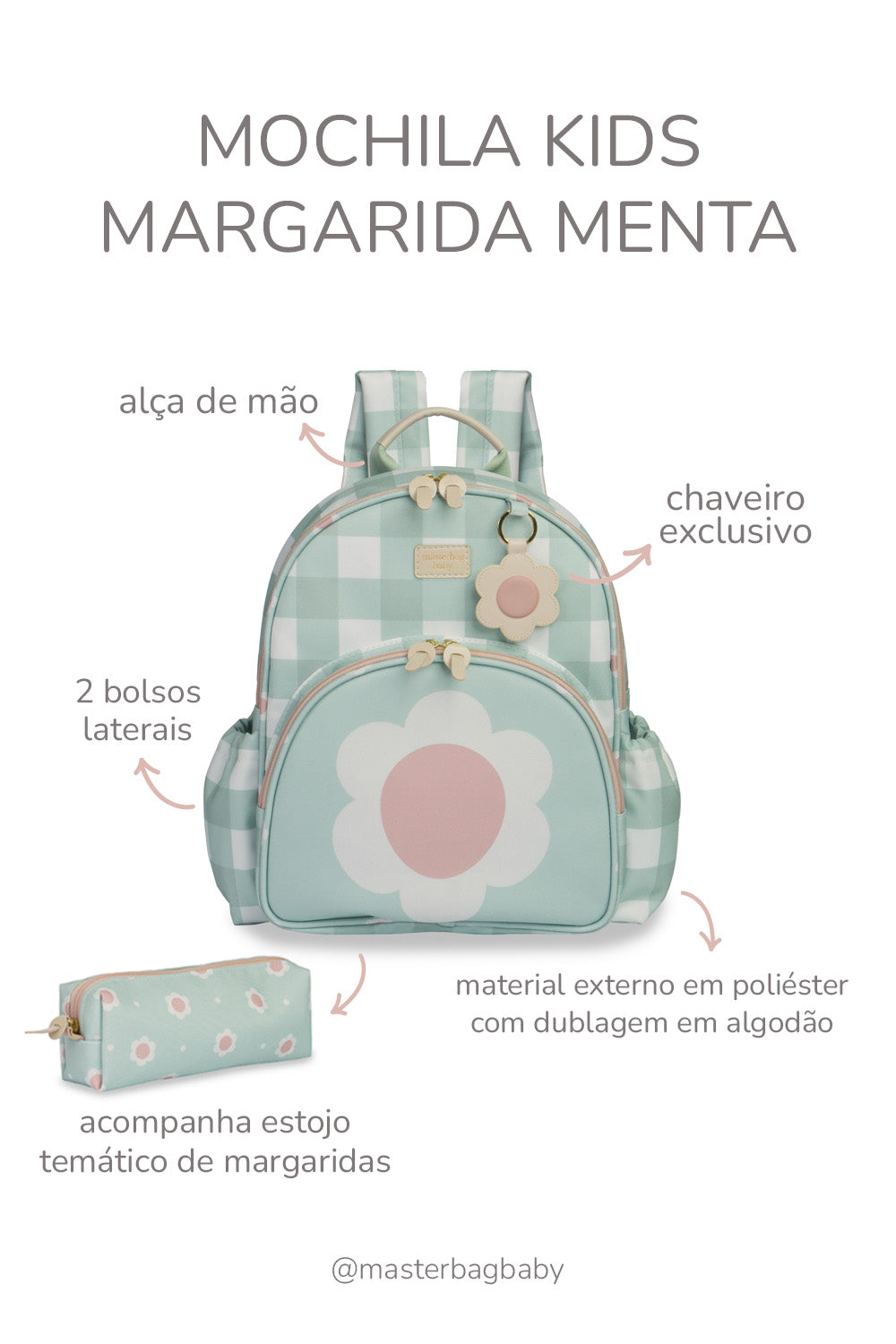 Mochila Kids Margaridas Menta – Funcional e ideal para rotina escolar