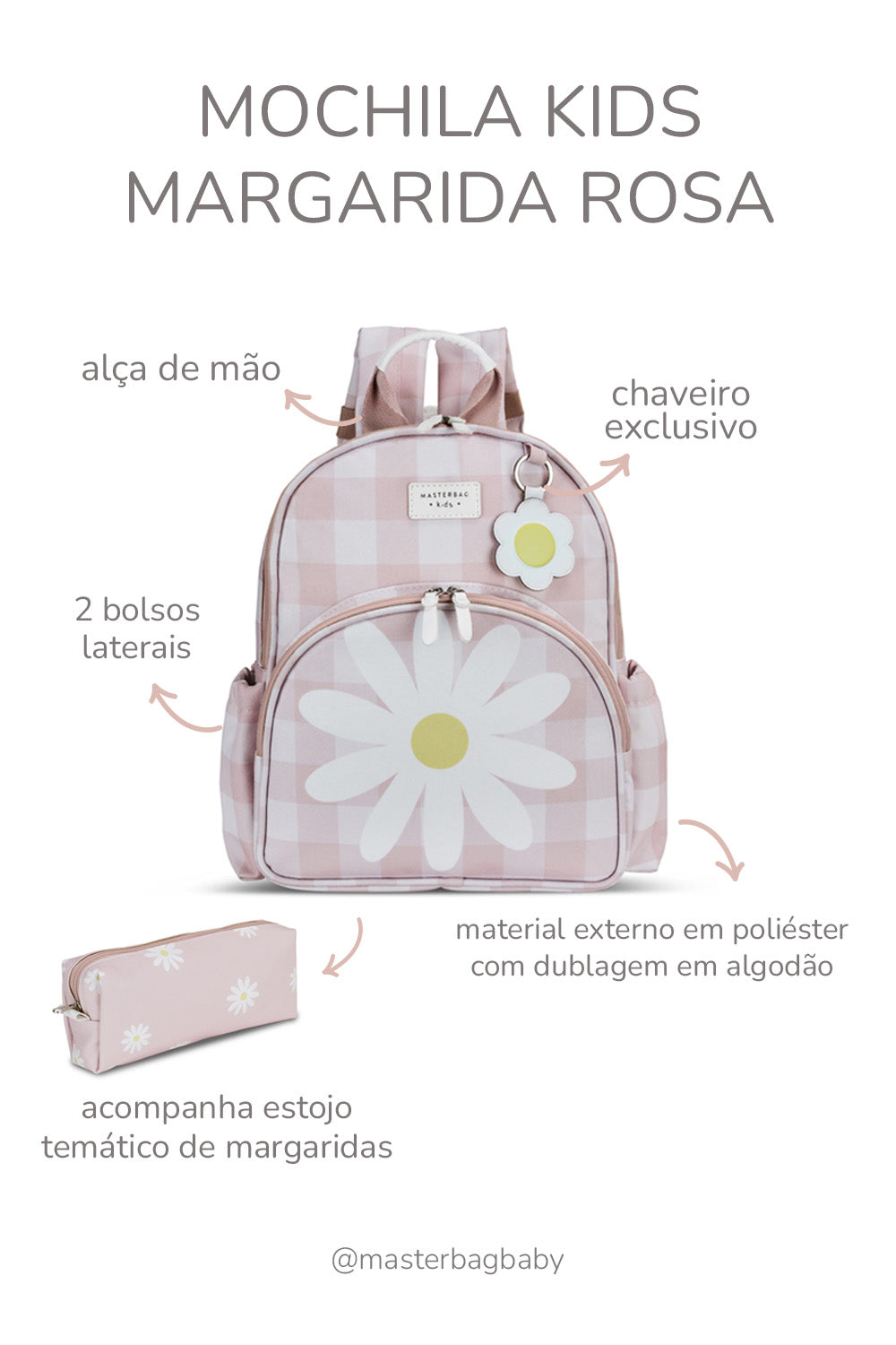 Acompanha estojo temático de margaridas – perfeito para organizar o material escolar ou até remedinhos na hora do passeio.