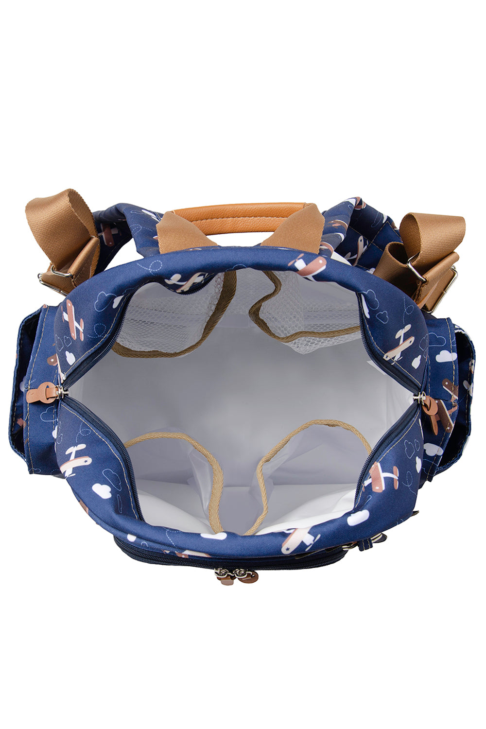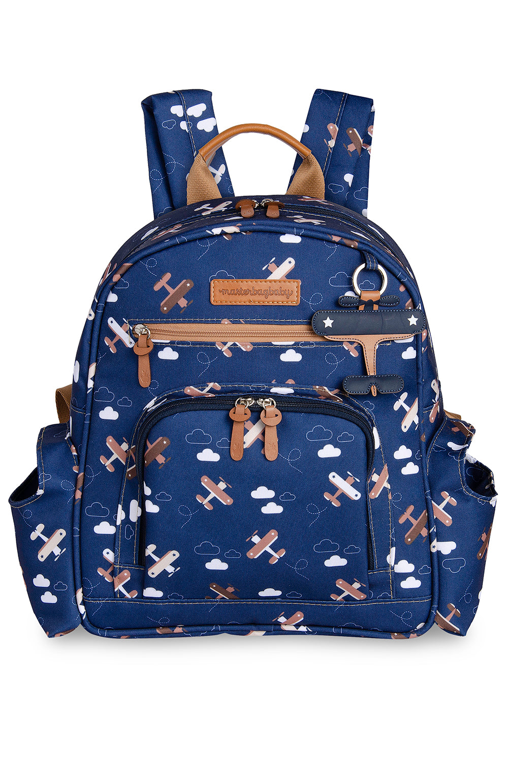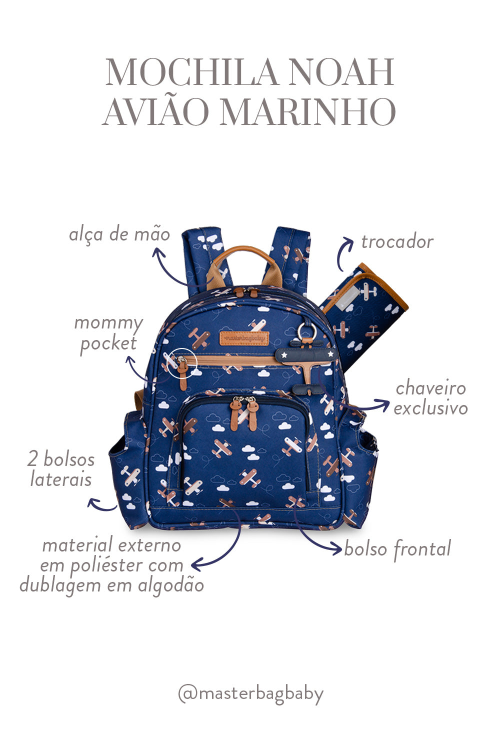 Mãos livres e muito estilo! A Mochila Noah Avião é um item indispensável no enxoval do seu bebê. Internamente ela possui quatro bolsos para organizar os acessórios do seu pequeno. Na parte externa possui dois bolsos laterais para garrafinhas e dois bolsos frontais, um deles chamado "Mommy Pocket" para os itens da mamãe. Acompanha trocador e tag.