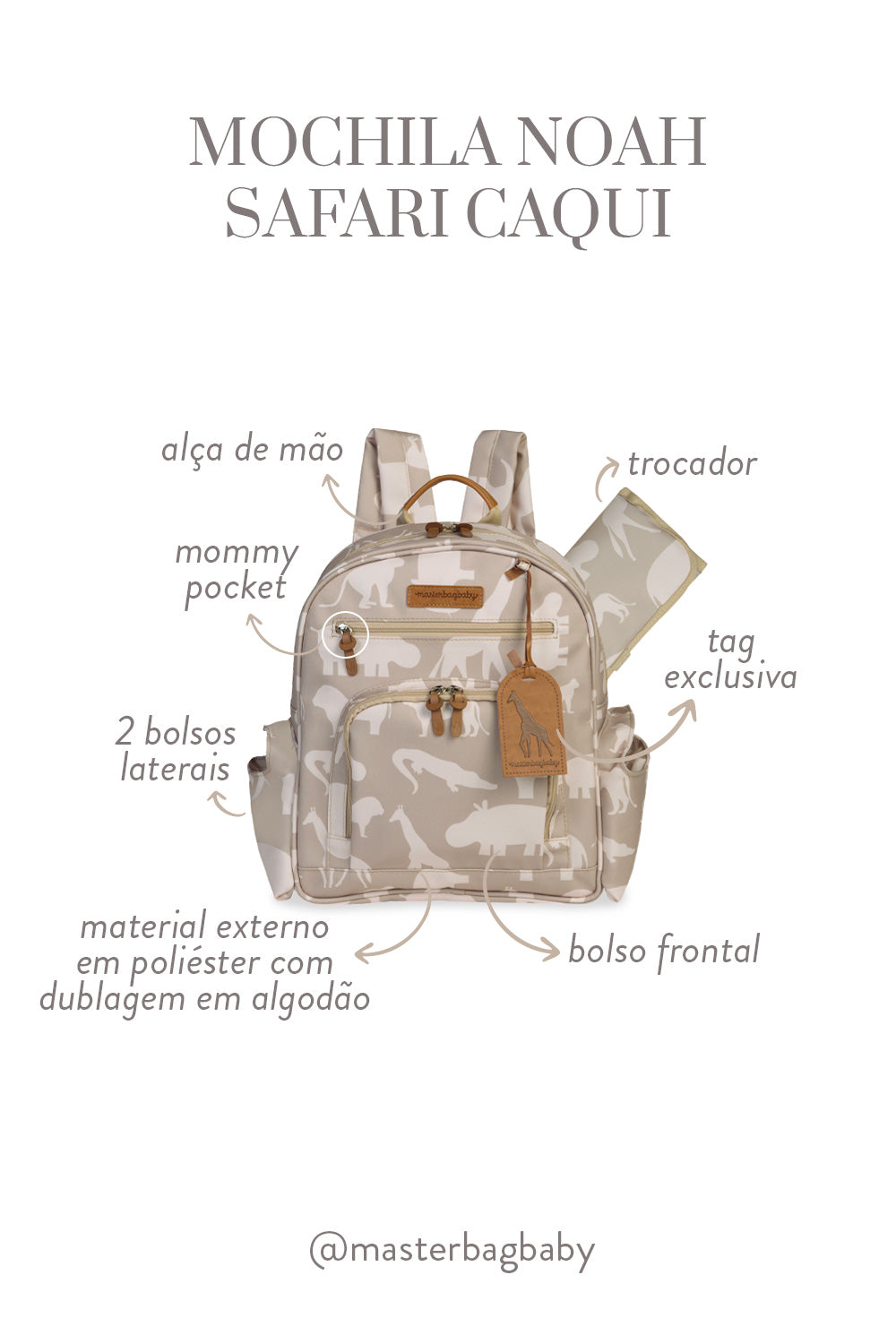 Mãos livres e muito estilo! A Mochila Noah Safari é um item indispensável no enxoval do seu bebê. Internamente ela possui quatro bolsos para organizar os acessórios do seu pequeno. Na parte externa possui dois bolsos laterais para garrafinhas e dois bolsos frontais, um deles chamado "Mommy Pocket" para os itens da mamãe. Acompanha trocador e chaveiro no tema safari.