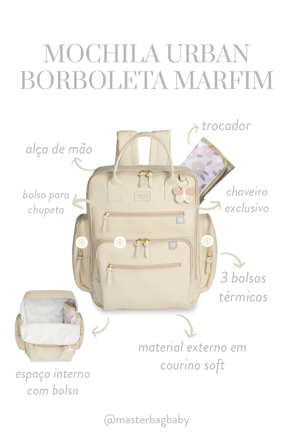 A Mochila Urban Borboletas Marfim Masterbag Baby é a escolha ideal para quem busca praticidade e muito espaço. Ela é perfeita para diferentes passeios com o (seu) bebê, oferecendo organização e conforto em todos os momentos.