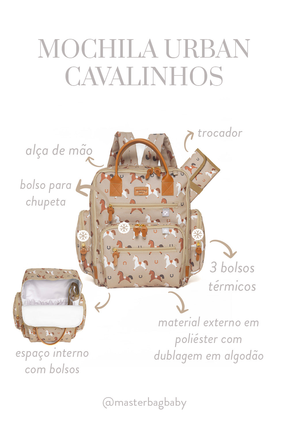 A Mochila Urban Cavalinhos Estampada Masterbag Baby é a escolha ideal para quem busca praticidade e muito espaço. Ela é perfeita para diferentes passeios com o (seu) bebê, oferecendo organização e conforto em todos os momentos.