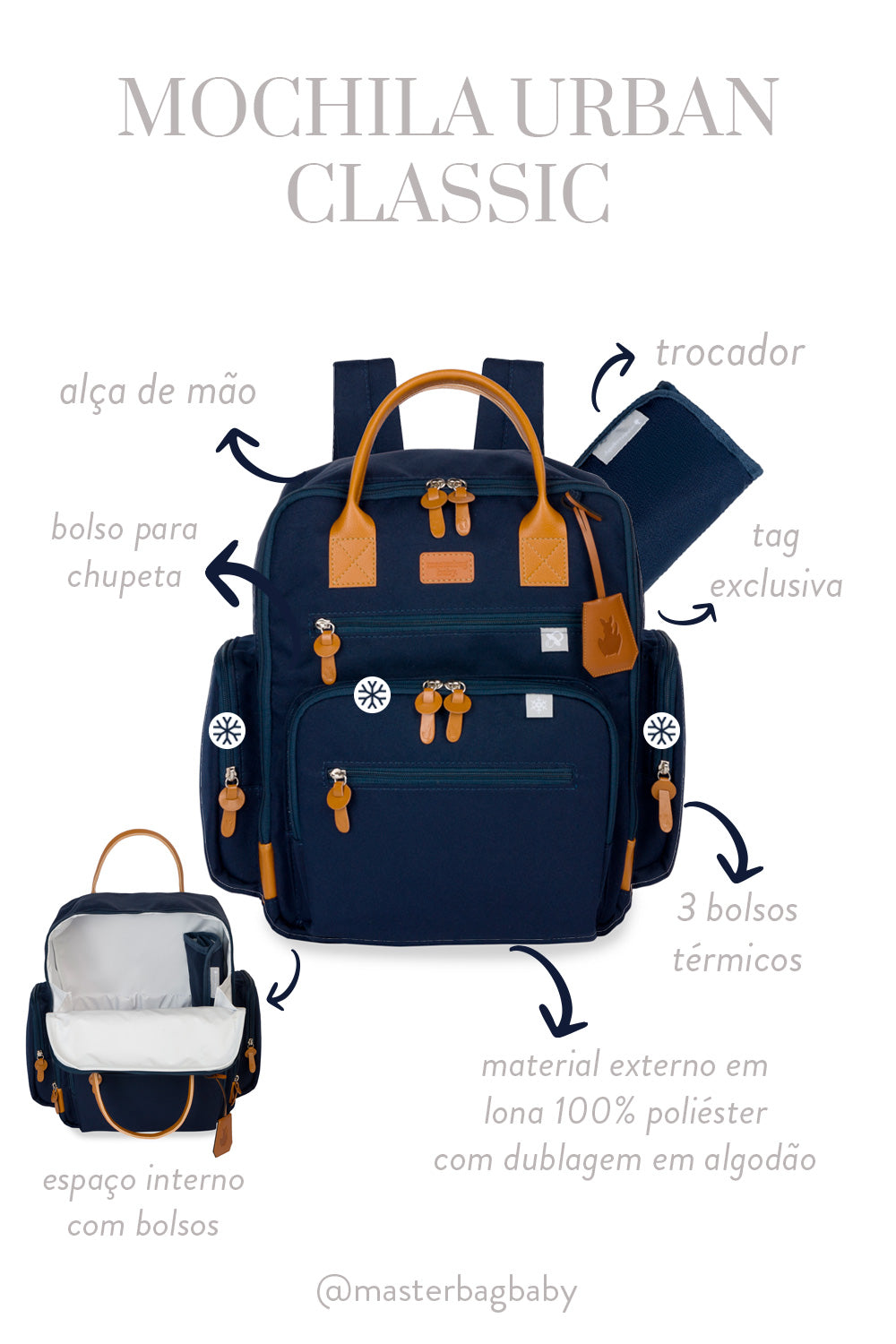 É um modelo exclusivo Masterbag Baby, feito para tornar a rotina com o bebê mais leve, prática.