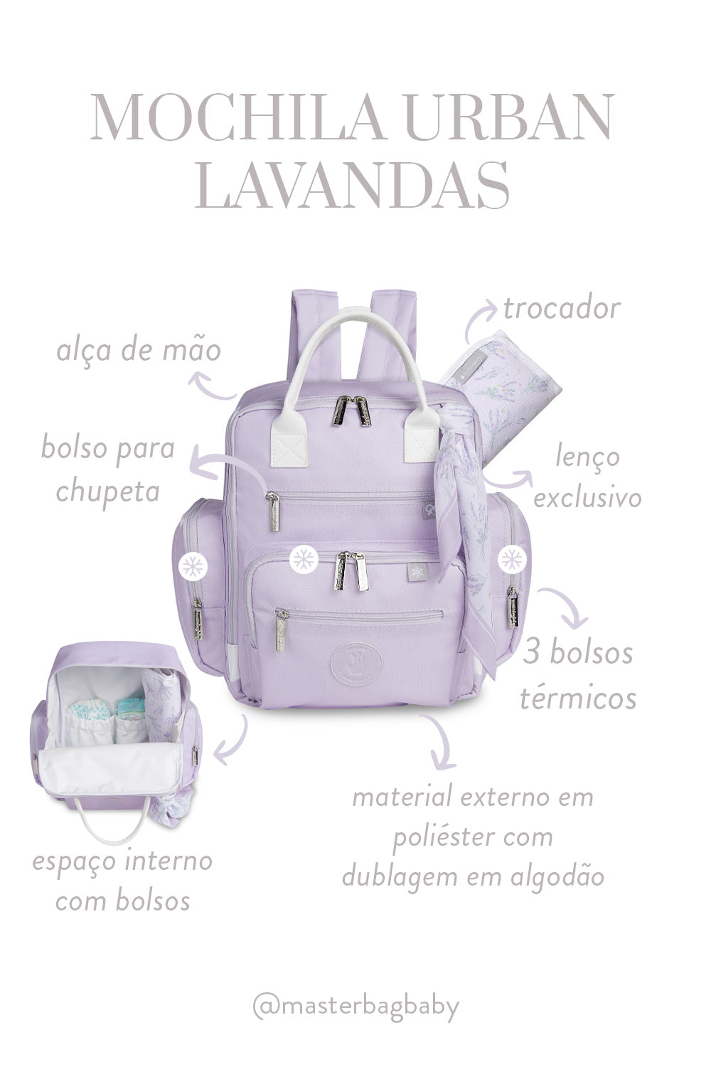 A Mochila Urban Lavandas Masterbag Baby é a escolha ideal para quem busca praticidade e muito espaço. Ela é perfeita para diferentes passeios com o (seu) bebê, oferecendo organização e conforto em todos os momentos.