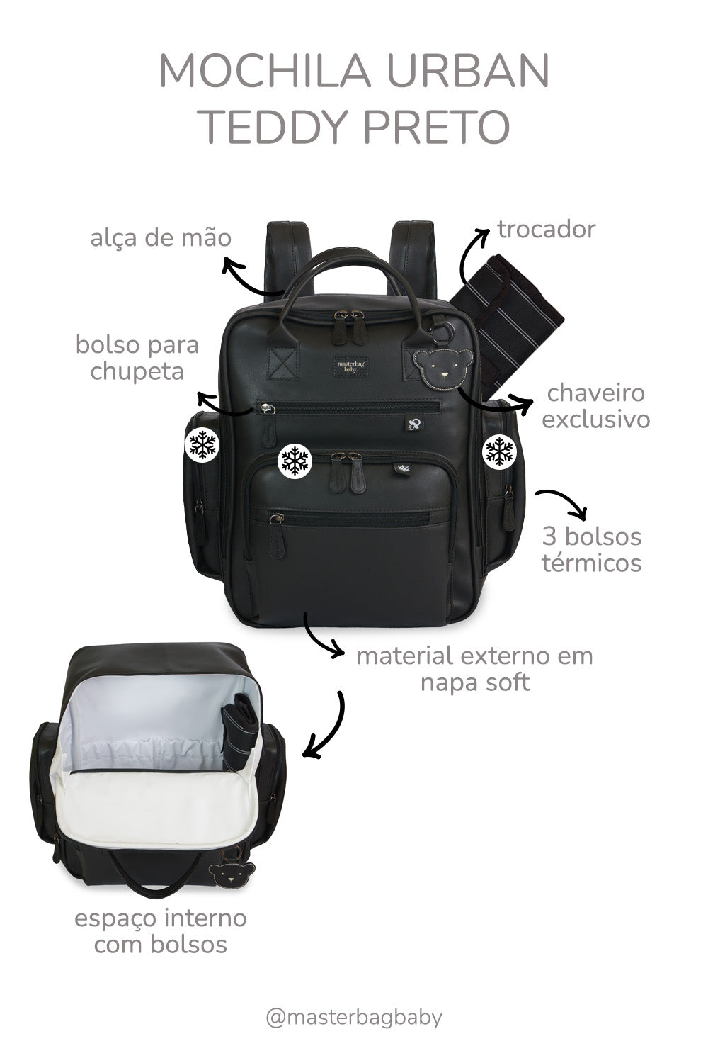 É um modelo exclusivo Masterbag Baby, feito para tornar a rotina com o bebê mais leve, prática