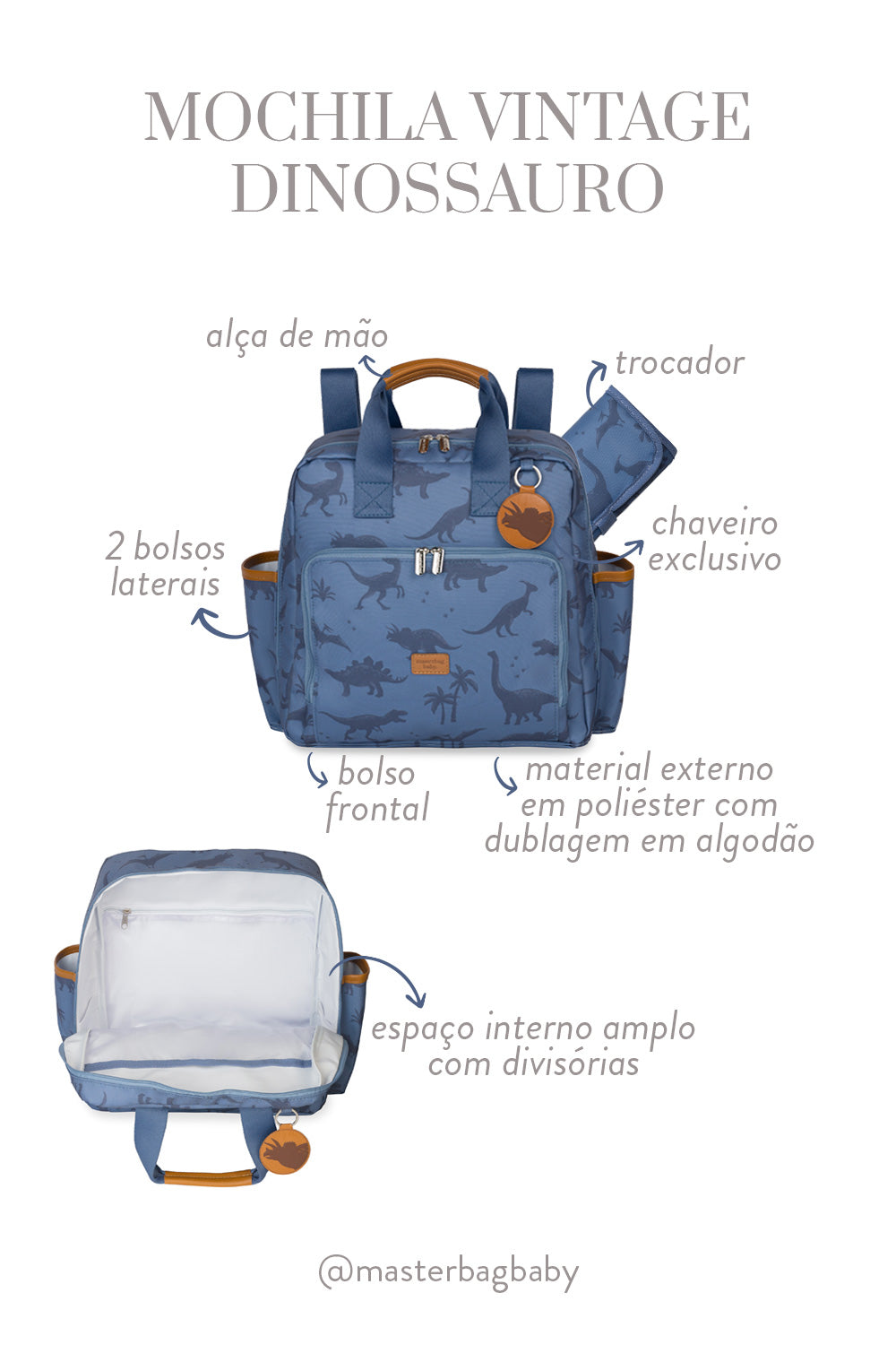 A Mochila Vintage Dinossauro Masterbag Baby é prática, clássica e com espaço para tudo o que importa. Foi feita para acompanhar a rotina dos papais e mamães na maternidade, viagens ou passeios com ainda mais facilidade.